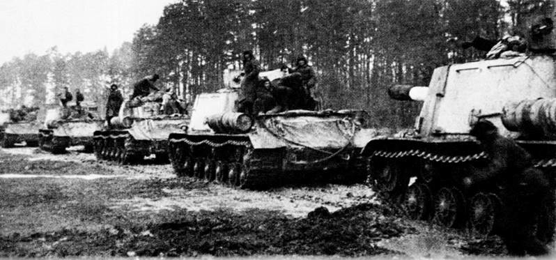 Перед наступлением в Восточной Пруссии. Легендарные ИСУ-152 еще с Курской битвы получили у советских солдат прозвище "Зверобой" , а у немецких - "Dosenoffner" (открыватель консервных банок).