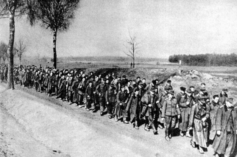 Восточная Пруссия. Колонна немецких пленных.Наше провальное, с военной точки зрения, лето 1941–го вернулось немцам весной 1945–го. Вот уж поистине: посеявший ветер – пожнет бурю.